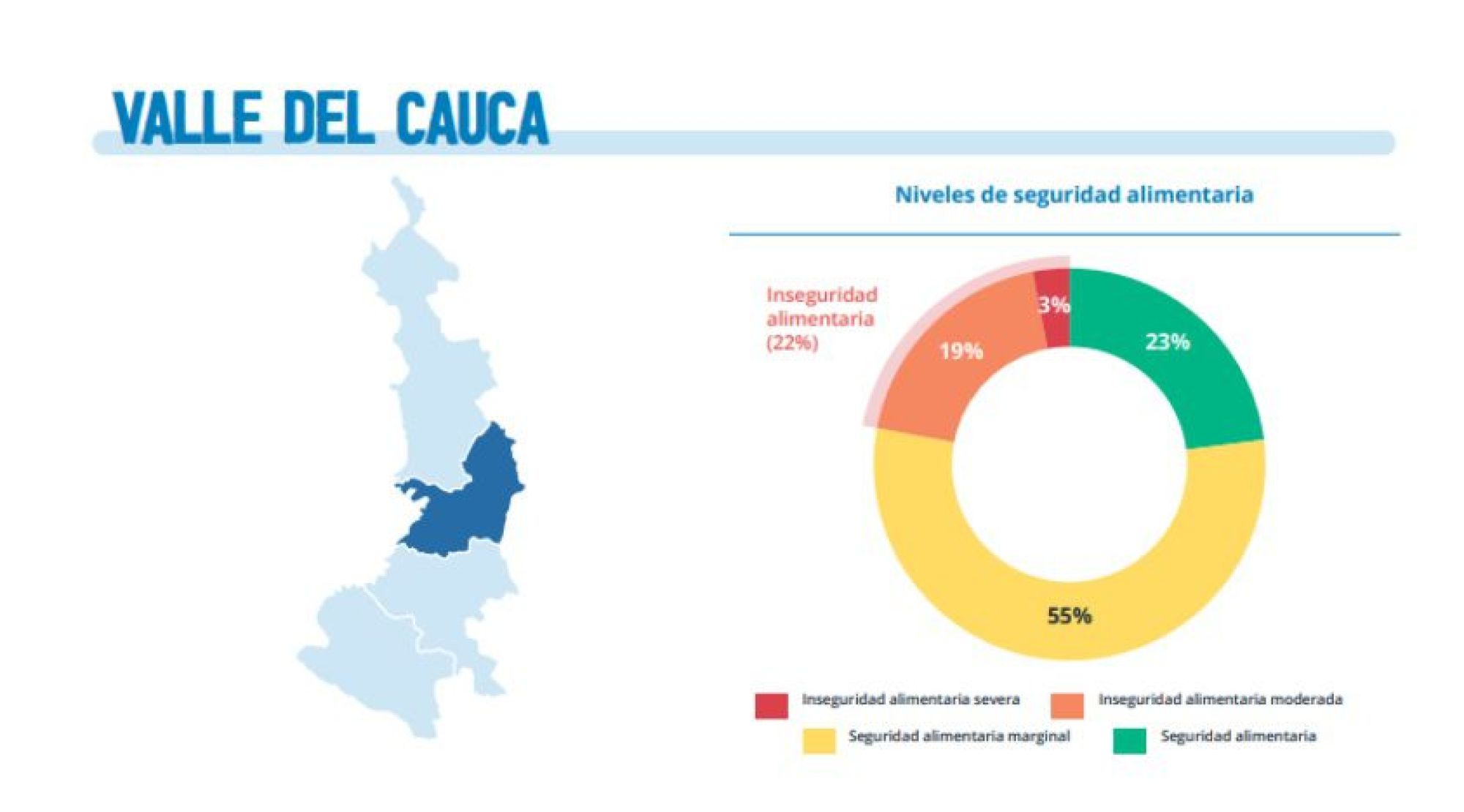 El Programa Mundial de Alimentos, en el segundo semestre del 2022, realizó una evaluación enfocada en la seguridad alimentaria por departamento. Ahí, el Valle del Cauca aparece con un índice de inseguridad alimentaria del 22 por ciento, es decir, uno de cada cinco hogares se encuentra en inseguridad alimentaria en el departamento.