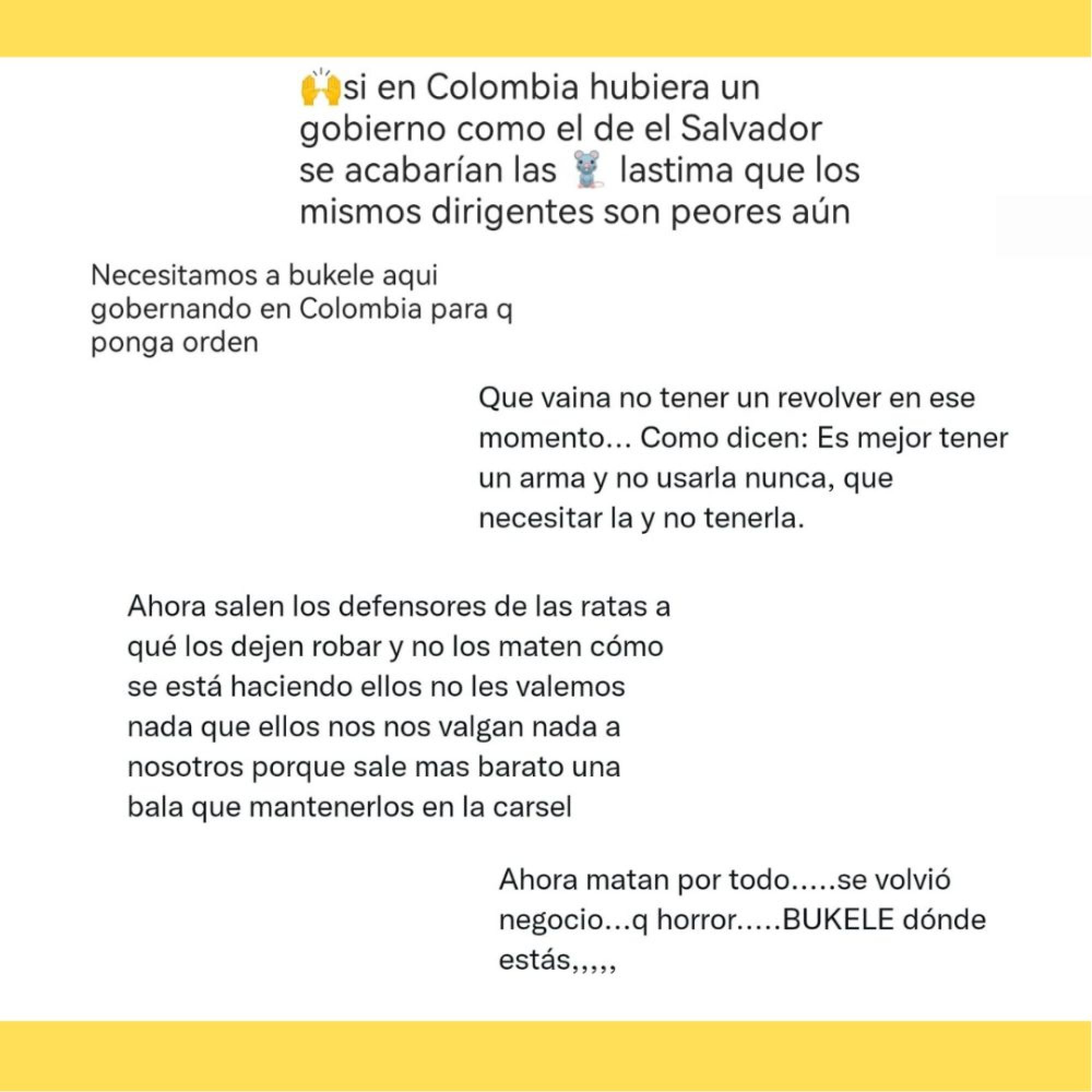 Sin embargo, a pesar de ello, el presidente tiene la aceptación más alta en su país y es uno de los más populares en redes sociales cuando se reportan noticias sobre un delito. Por esto, en Hechoencali.com hicimos una pequeña revisión de los comentarios en algunas redes sociales cuando otros medios reportan hechos delincuenciales sucedidos en Cali y encontramos cosas como: “Necesitamos que Bukele gobierne Colombia para que haya orden”, otro internauta dice: “Qué vaina no tener un revolver en este momento…es mejor tener un arma y no usarla nunca, que necesitarla y no tenerla”. Otros van más lejos y escriben: “Cuánta falta hacen los grupos de limpieza social” y “Ahora matan por todo… se volvió negocio. Bukele donde estás”.