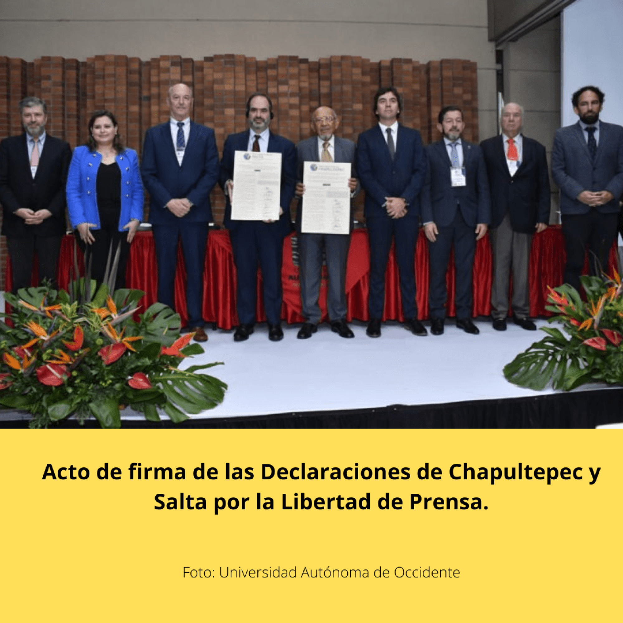 Este año las declaraciones fueron firmadas en Cali, en la Universidad Autónoma de Occidente, en marco del XI Encuentro internacional de programas acreditados por el Consejo Latinoamericano de Acreditación de la Educación en Periodismo y Comunicación (CLAEP). En el acto participaron Michael Greenspon, presidente de la Sociedad Interamericana de Prensa, SIP, y director global de Licencias e Innovación de Impresión del New York Times; Luis H. Pérez, rector de la UAO; Ricardo Trotti, director ejecutivo de la SIP; Óscar Domínguez, director ejecutivo de la Asociación Colombiana de Universidades, Ascun; Werner Zitzmann, director ejecutivo de la Asociación de Medios de Información, AMI; Tulio Ángel, presidente de Asomedios; Jonathan Bock, director ejecutivo de la Fundación para la Libertad de Prensa, FLIP y Catalina Jiménez, decana de la facultad de Comunicación Social, Periodismo y Medios Digitales de la UAO.