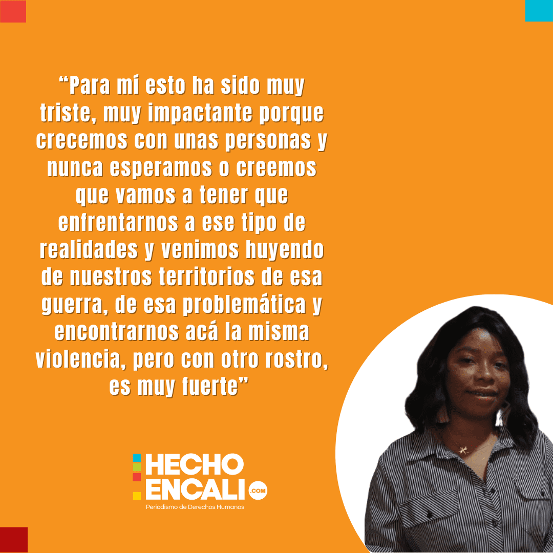A pesar de tener que dejar su territorio, la primera vez que vio a Llano Verde le dio buena impresión. “Todo se parece. La organización, todo estaba divino. Fue muy acogedor. Hay muchas prácticas parecidas a las de nuestros territorios. Siempre está el tema de compartir, el respeto hacia el adulto mayor, todo. Entonces como que no fue muy alejado de lo que yo vivía en mi territorio ¡Sólo me faltaba el río y la canoa!” Se ríeSin embargo esa sensación de belleza y organización del barrio cambió cuando Alejandrina vio que la muerte, que tan presente estaba en Satinga, la había seguido también a Cali.